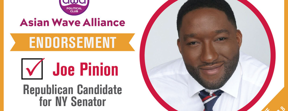 Asian Wave Alliance is endorsing candidates who participated in our endorsement process, align best with our core values and will serve our community well if elected. For NYS Attorney General, we endorse Michael Henry, for NYS Comptroller, we endorse Paul Rodriguez, for U.S. Senate, we endorse Joe Pinion. For New York State Senate and Assembly, we endorse the following candidates: George Santos for Congressional District 3, Nicole Malliotakis for Congressional District 11, Stefano Forte for Senate District 11 (Qns), Joseph Addabbo for Senate District 15 (Qns), Vito LaBella for Senate District 17 (Bklyn), Maria Danzilo for Senate District 47 (Manh), Nily Rozic for Assembly District 25 (Qns), Michael Conigliaro for Assembly District 28 (Qns), Sharon Liao for Assembly District 40 (Qns), Alec Brook-Krasny for Assembly District 46 (Bklyn), William Colton for Assembly District 47 (Bklyn), Lester Chang for Assembly District 49 (Bklyn), and Sam Pirozzolo Assembly District 63 (S.I.).